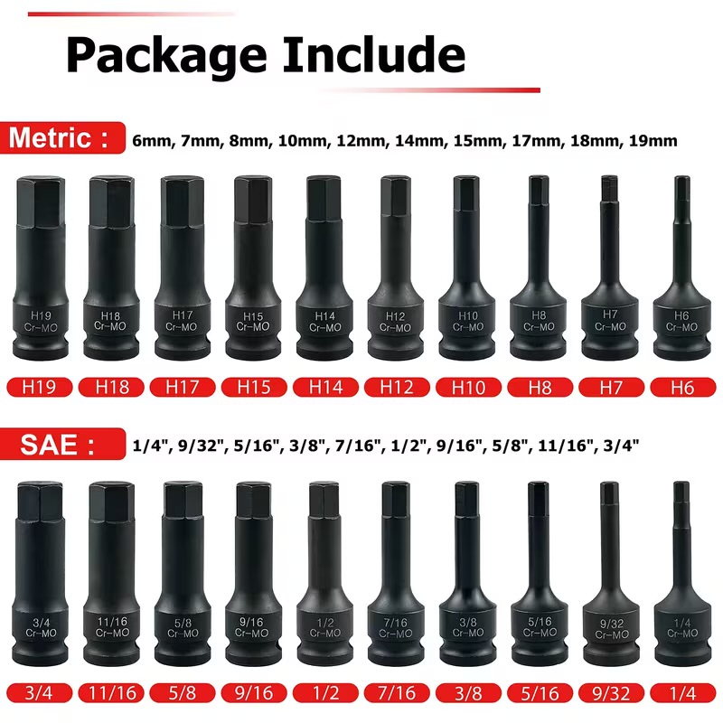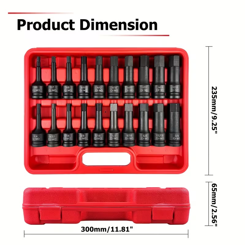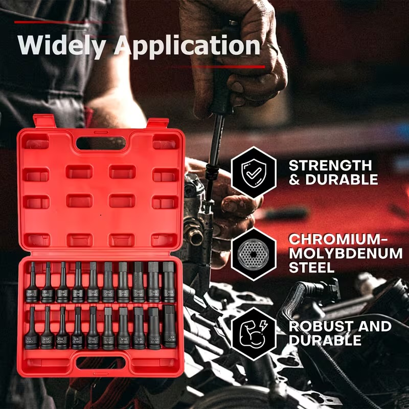 20 piece 1/2 inch drive impact hex bit socket set in metric and SAE, made from chrome molybdenum steel with a black phosphate finish. Built for hard jobs like brake calipers and stubborn hex bolts, supplied in a tough carry case to keep every size organised and ready to go.