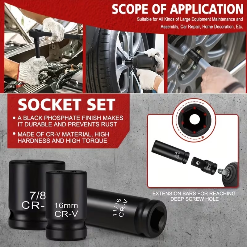66 piece heavy duty 1/2 inch drive impact socket set with 6 point sockets, ratchet handle and extension bar. Covers common metric 8–24 mm and SAE 3/8–1 1/4 sizes in a tough storage case, ideal for automotive, machinery and farm workshop jobs where you want one main kit to grab and go.