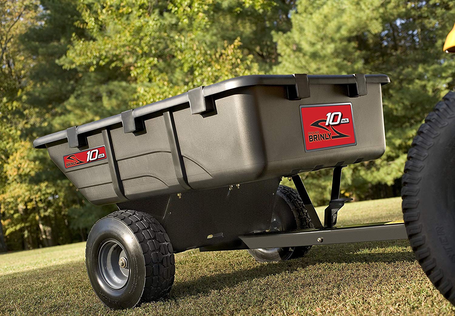 Brinly’s 650 lb. capacity, 10 cubic foot poly cart handles loads of firewood, topsoil, and more with ease. Attach the PCT-101BH lawn cart to your riding lawn mowers and small tractors to save time and your back.