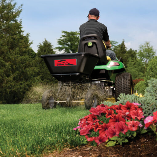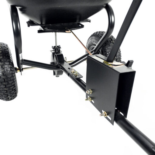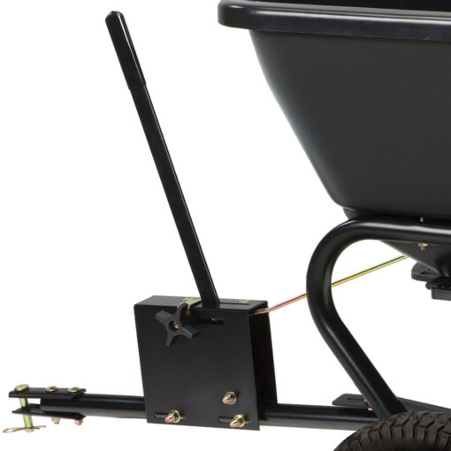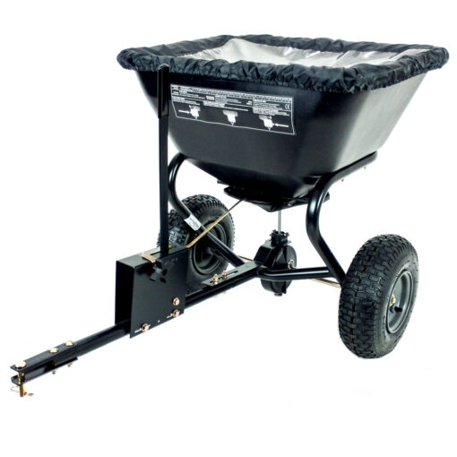 Tow behind 57 kg broadcast spreader with 70 litre polyethylene hopper, adjustable flow rate and 8–12 inch spread width. Made in the USA with stainless steel and solid steel running gear, ideal behind a ride on mower for spreading fertiliser, seed and ice melt over lifestyle and rural lawns.