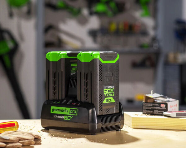 Simultaneously charges two Greenworks 60V batteries. Compatible with all Greenworks 60V batteries .