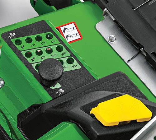 1.0 – 4.0 in (2.5 – 10.2 cm) in 0.25-in increments, adjustable via foot-operated deck lift. |